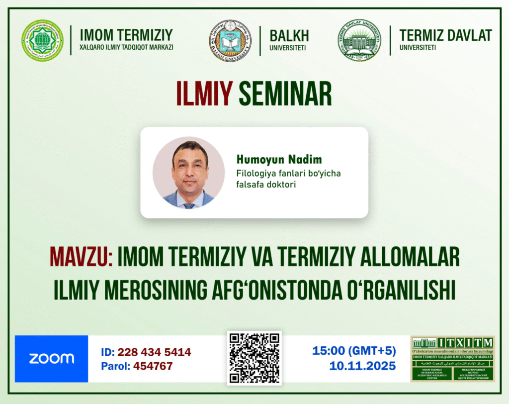 ⌛  Имом Термизий халқаро илмий-тадқиқот марказида ўтказилаётган “Имом Термизий ва термизий алломалар илмий меросининг Афғонистонда ўрганилиши” мавзусидаги илмий семинарга таклиф этамиз.