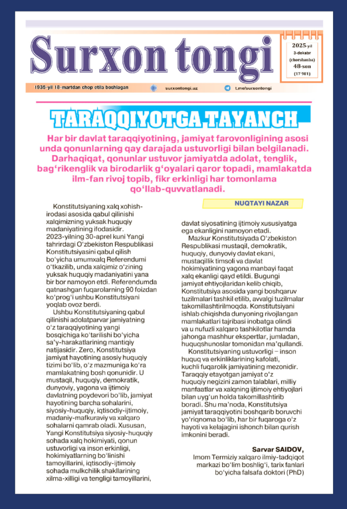 Конституциянинг устуворлиги – инсон ҳуқуқ ва эркинликларининг кафолати, кучли фуқаролик жамиятининг мезонидир. Тараққий этаётган жамият ўз ҳуқуқий негизини замон талаблари, миллий манфаатлар ва халқнинг ижтимоий эҳтиёжлари билан уйғун ҳолда такомиллаштириб боради. Шу маънода, Конституция жамият тараққиётини бошқариб борувчи йўриқнома бўлиб, ҳар бир фуқарога ўз ҳаёти ва келажагини ишонч билан қуриш имконини беради.