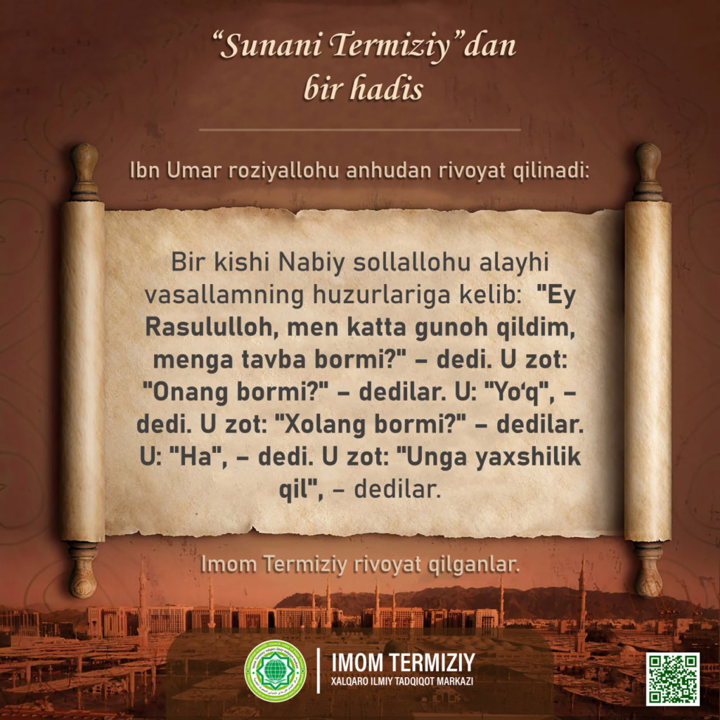 ✍️Ibn Umar roziyallohu anhudan rivoyat qilinadi: Bir kishi Nabiy sollallohu alayhi vasallamning huzurlariga kelib: «Ey Rasululloh, men katta gunoh qildim, menga tavba bormi?» – dedi. U zot: «Onang bormi?» – dedilar. U: «Yo‘q», – dedi. U zot: «Xolang bormi?» – dedilar. U: «Ha», – dedi. U zot: «Unga yaxshilik qil», – dedilar.