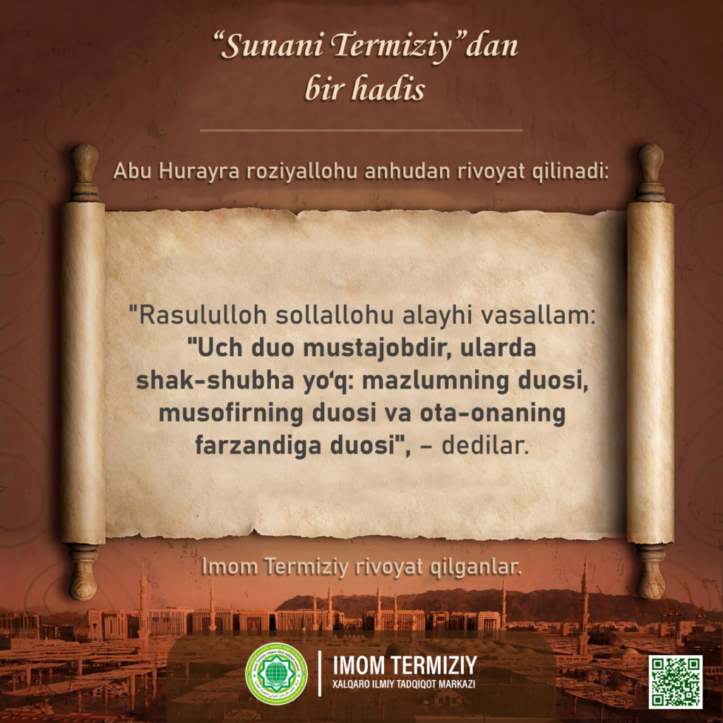 «Rasululloh sollallohu alayhi vasallam: «Uch duo mustajobdir, ularda shak-shubha yo‘q: mazlumning duosi, musofirning duosi va ota-onaning farzandiga duosi», – dedilar».