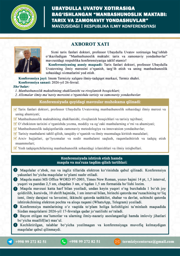 🔰2026-yil 26-fevral kuni Imom Termiziy xalqaro ilmiy-tadqiqot markazida Ubaydulla Uvatov xotirasiga bag‘ishlangan “Manbashunoslik maktabi: tarix va zamonaviy yondashuvlar” mavzusidagi I respublika ilmiy konferensiya tashkil etiladi.