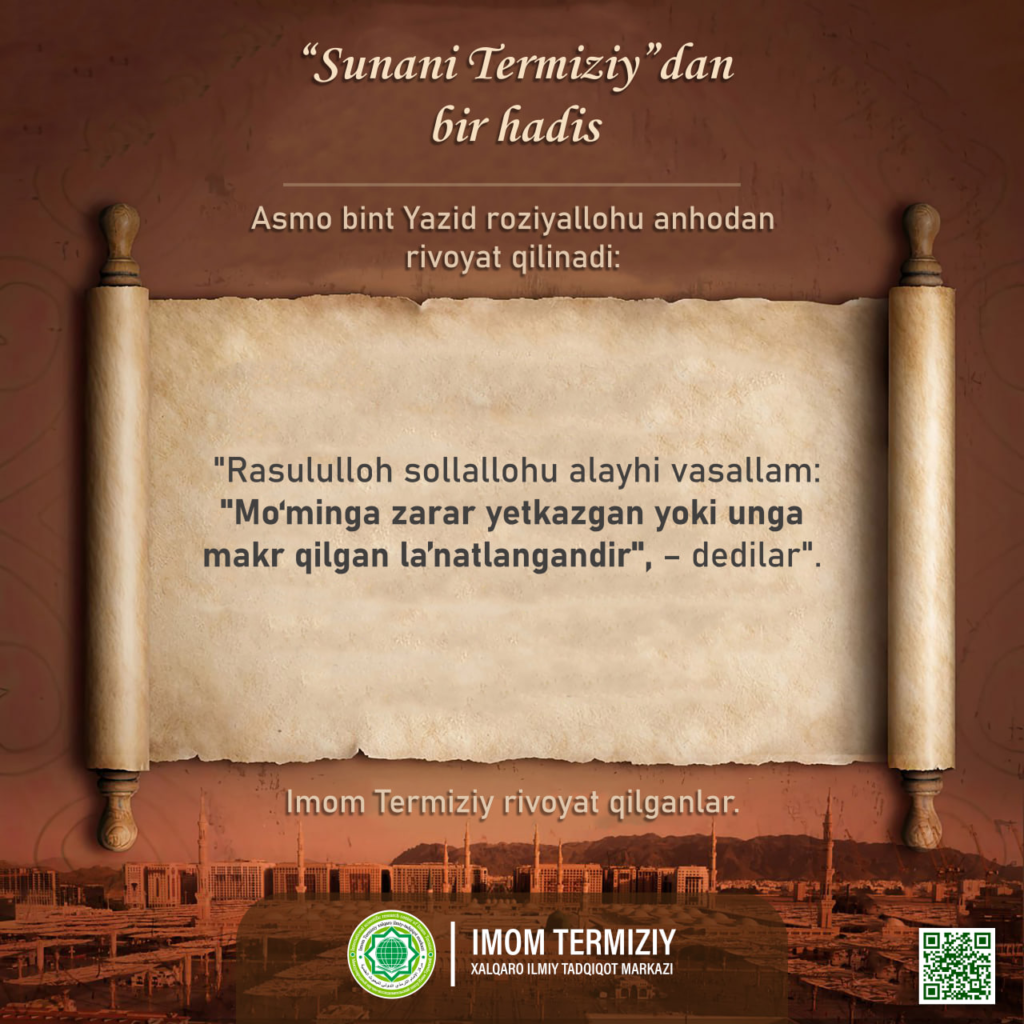 “SUNANI TERMIZIY”dan bir hadis by Matbuot xizmati Fevral 5, 2026 Fevral 5, 2026 5 👁️ 5 Kun_hadisi 📝“SUNANI TERMIZIY”dan bir hadis ✍️Abu Bakr Siddiq roziyallohu anhudan rivoyat qilinadi:«Rasululloh sollallohu alayhi vasallam: «Mo‘minga zarar yetkazgan yoki unga makr qilgan la’natlangandir», – dedilar». ✍️Imom Termiziy rivoyati FacebookTwitterVKTelegramEmail MARTABANI TARK ETIB, KOMILLIKKA ERISHGAN SHOIR Surxondaryo vohasida ziyorat turizmini rivojlantirish masalalari muhokama qilindi