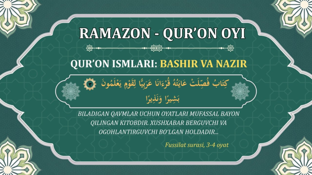 BILADIGAN QAVMLAR UCHUN OYATLARI MUFASSAL BAYON QILINGAN KITOBDIR. XUSHXABAR BERGUVCHI VA OGOHLANTIRGUVCHI BO‘LGAN HOLDADIR. FUSSILAT, 3-4.
