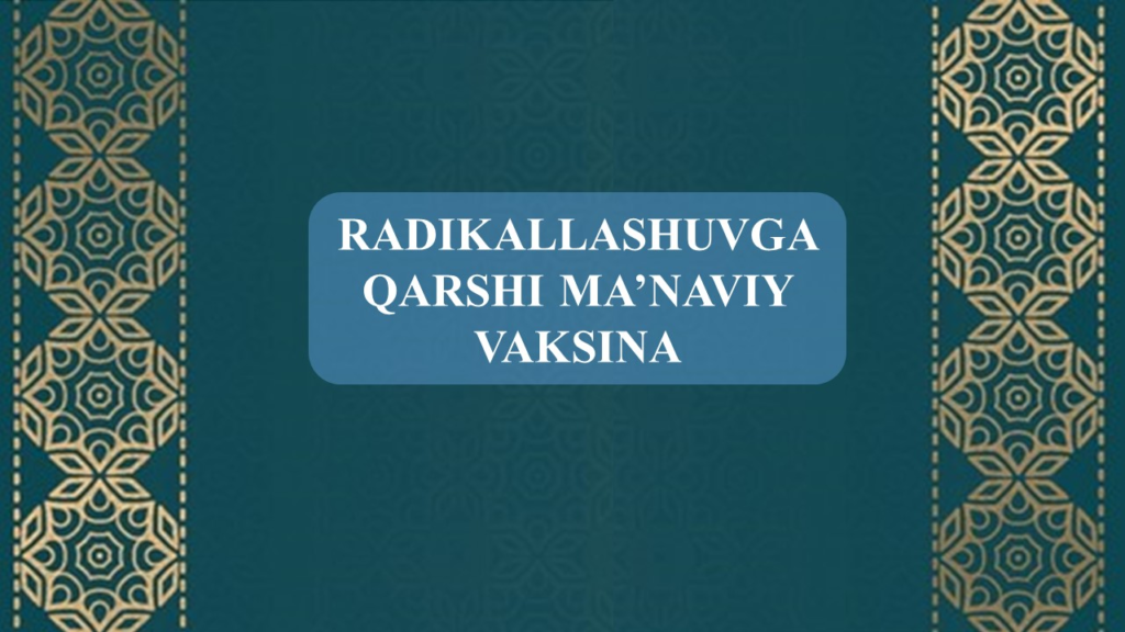 Bugungi globallashuv davrida jamiyat a’zolari o’rtasida, xususan yoshlar orasida sof ma’rifiy islom tamoyillarini to’g’ri tushunmaslik, go’zal axloqiy fazilatlarni targ’ib qiluvchi diniy tushunchalarni noto’g’ri talqin qilish holatlari ko’p kuzatilmoqda. Bu esa o’z navbatida jamiyatda turli yot g’oyalar ta’siriga berilish holatlarining kuzatilishiga, radikallashuvga sabab bo’lmoqda. Radikallashuv nafaqat shaxsning hayotiga, balki butun jamiyatning tinchligi va barqarorligiga tahdid soladi. Shu sababli, ushbu illatga qarshi kurashishning eng samarali yo‘li – bu ma’naviy vaksina, ya’ni insonlarni ma’rifat bilan qurollantirishdir. Ma’rifat, ta’bir joiz bo’lsa, radikal g’oyalarga qarshi eng samarali ma’naviy vaksinadir. Ma’naviy vaksina tushunchasi ramziy ma’noda bo’lib, u inson qalbini zo‘ravonlik va adolatsizlikka olib boruvchi g‘oyalardan himoya qilishga xizmat qiladi.