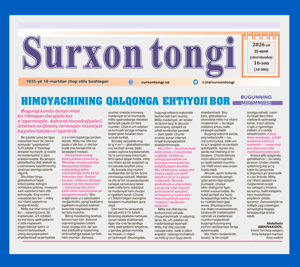 Ma’rifat — bu shunchaki bilim emas. U insonning ongliligi, tafakkuri, axloqiy qarashlari va hayotga munosabatini belgilaydigan kuchdir. Ma’rifatli inson axborotni tanlay oladi, uni tahlil qiladi va to‘g‘ri xulosa chiqaradi. Demak, globallashuv sharoitida aynan ma’rifat insonni turli axborot xurujlari va begona g‘oyalardan himoya qiluvchi asosiy “qalqon” vazifasini bajaradi.